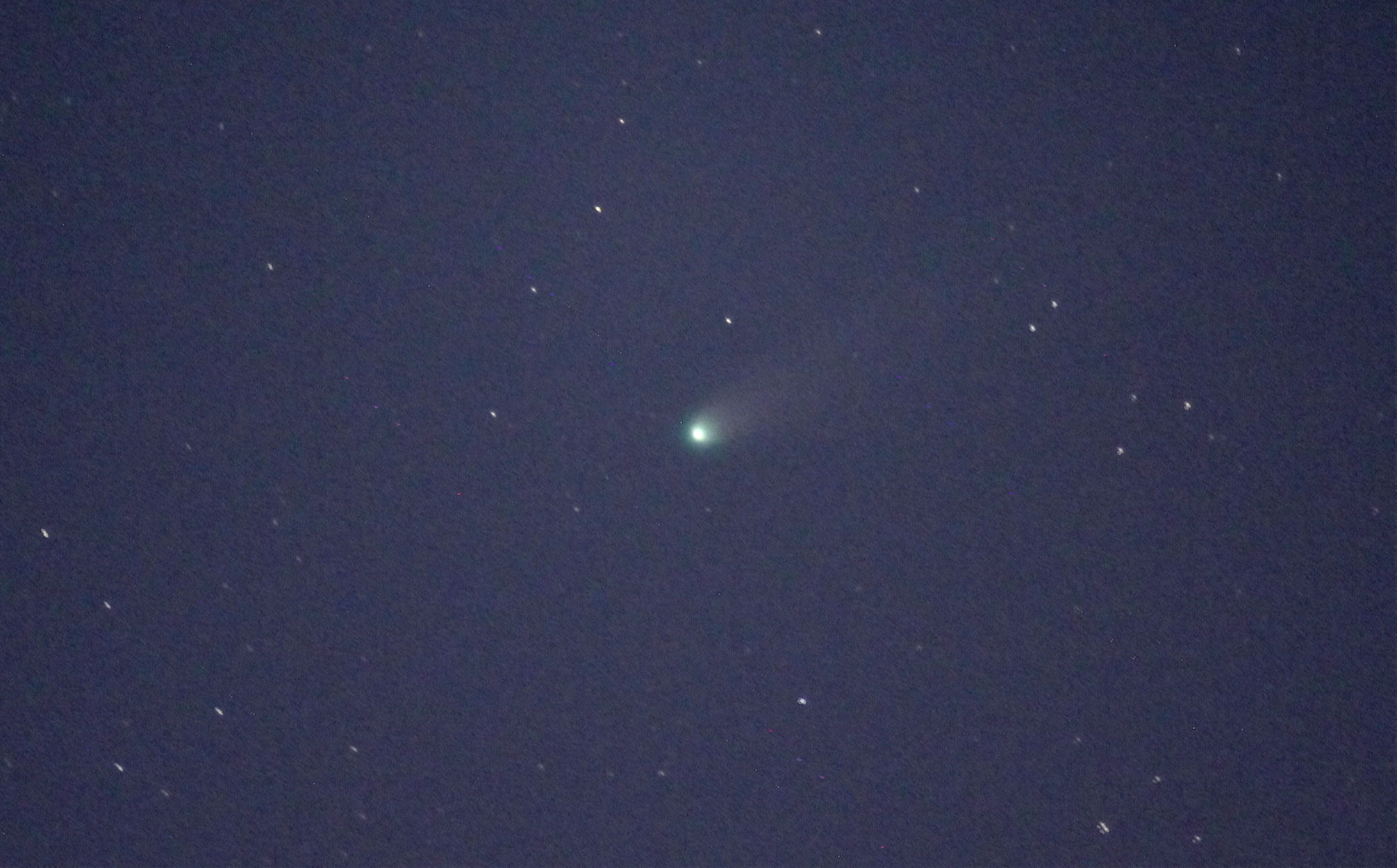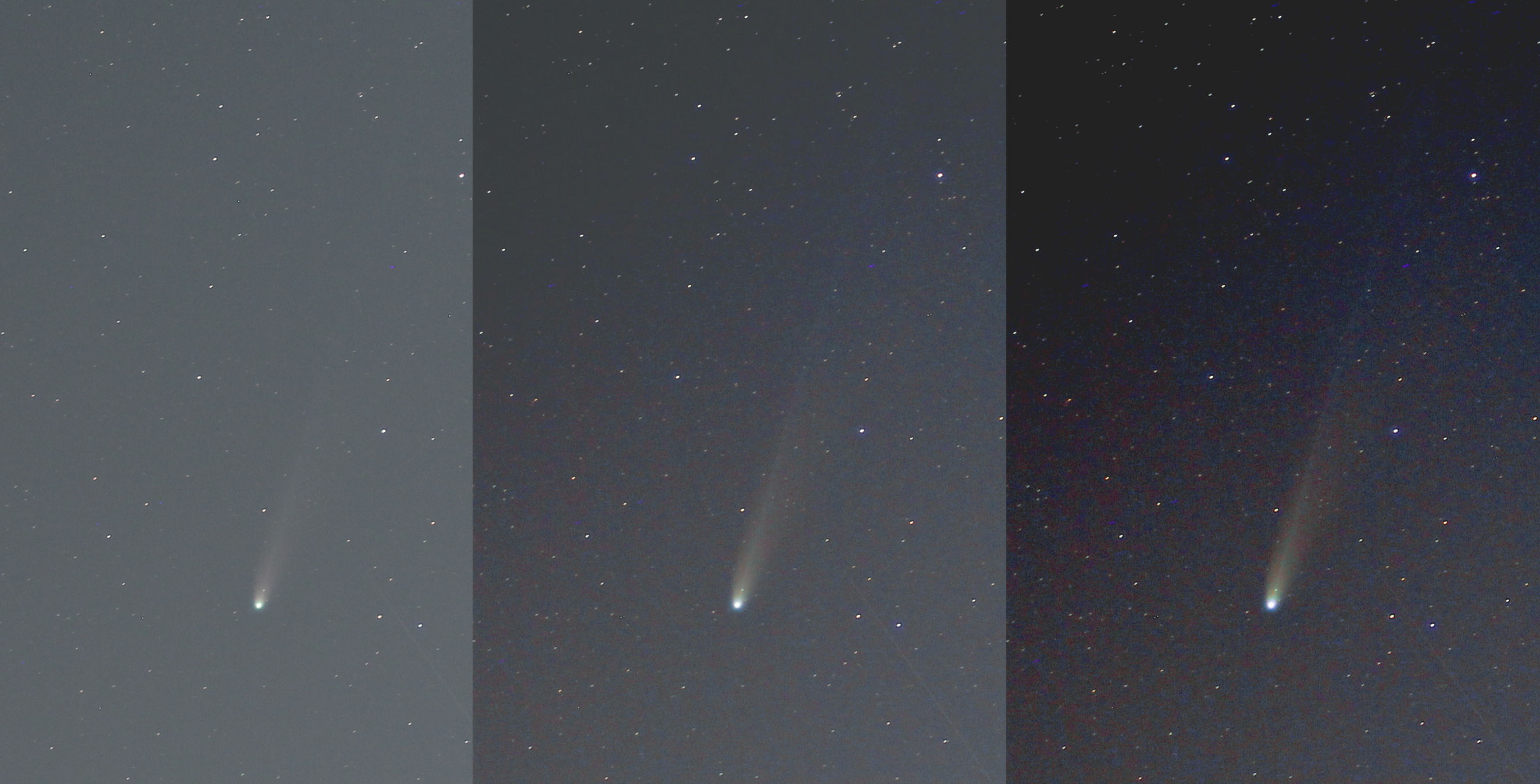 Obstacles to imaging included city sky-glow, park lights, residual twilight, a glowing crescent Moon, and the now ever present streaks of Starlink satellites crossing nearly every exposure. Even so, it was a nice evening with a few curious pedestrians stopping by to see what I was up to. The image shown here is the same picture of the comet with increasing attempts to eek out a little more detail with the image on the left showing the comet unprocessed out of the camera. Astro-imaging processing can get very elaborate but nothing more here than some adjustments to the brightness, contrast and an attempt to subtract out some of the greenish-gray sky-glow produced by city lights. Still, perhaps a better result than my last comet Lemmon outing. And now, once again, Farewell Comet Lemmon.